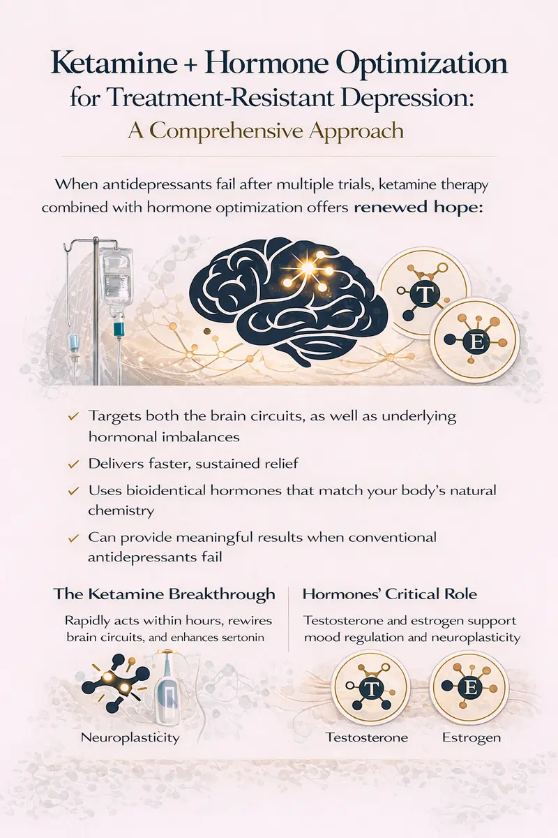 When antidepressant medications fail to work after multiple attempts, the diagnosis becomes treatment-resistant depression (TRD). Nearly 3 million Americans face this challenging condition, where traditional treatments offer little relief. But emerging research points to a powerful combination: ketamine therapy paired with hormone optimization.